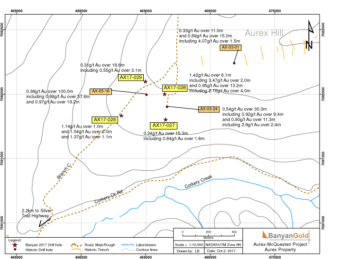 BANYAN GOLD CORP. (“Banyan” or the “Company”) is pleased to release results of four drill holes on the Aurex Hill target, the final drill results of the recently completed 10-hole drill campaign on the Aurex-McQuesten Property (the “Property”). The Company has previously announced results from six holes, on the McQuesten Showing (see news releases dated July 28th, September 11th and 13th, 2017). All of the four holes targeting the Aurex Hill Showing, located approximately 2.9 km south of the McQuesten Showing, encountered near surface anomalous gold mineralization as detailed in the table below.