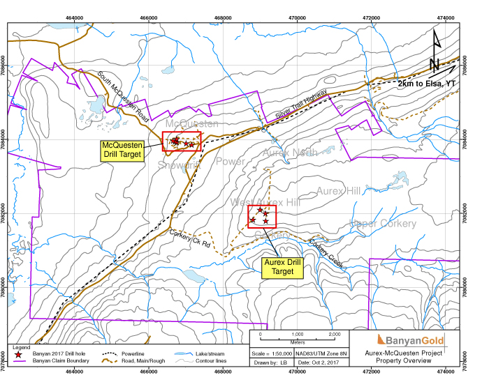Tara Christie, President & CEO, states “Banyan’s 2017 Exploration Program focused on trenching and drilling in two primary target areas, the McQuesten and Aurex Hill and has been effective in defining and expanding the known near surface mineralization in these zones. The property is underexplored with many targets to follow up on. Banyan is uniquely positioned to cost effectively advance the Property after consolidating the land position this spring, and thereafter compiling the geological and geophysical data set. This was followed-up with an effective exploration program funded by Alexco Resource Corp and Victoria Gold Corp, as part of the acquisition deal. The program involved drilling, trenching, a VTEM survey and a property wide geochemical survey, resulting in the identification of new target areas.”