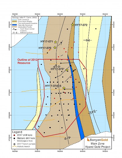 These drill holes of the 2017 program targeted anomalous gold+silver mineralization uncovered by early program surface trenches, north of the Main Zone.  Drill holes HY17-070 and HY17-071 defined mineralization to the north following the upper limb of the interpreted antiform.  HY17-072 was a 150m step-out hole north from other 2017 drilling and approximately 300m north from the historic Main Zone Resource* and has established Main Zone like grades including 0.4g/t Au and 0.1g/t Ag over 13.9m.  All holes intercepted anomalous gold-silver mineralization in the interpreted upper and lower limbs of the hosting antiformal structure related to sulphide-bearing, siliceous altered rocks, typical of mineralization observed in the Main Zone.