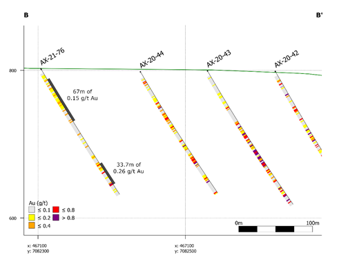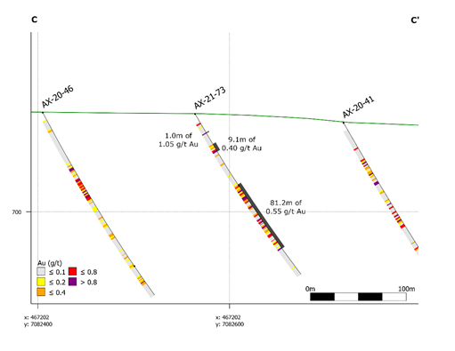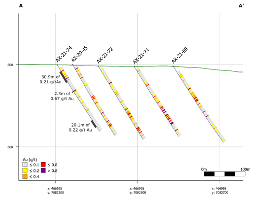 - 0.55 g/t Au over 81.2 metres from 86.5 m in AX-21-73