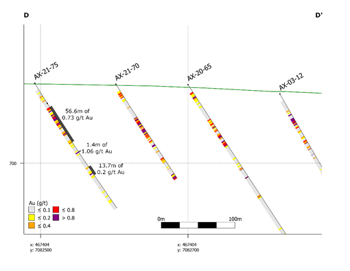 - 0.73 g/t Au over 56.6 metres from 38.1 m in AX-21-75
