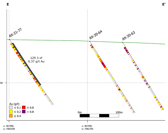 - 0.37 g/t Au over 129.3 metres from surface in AX-21-77