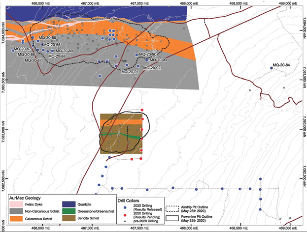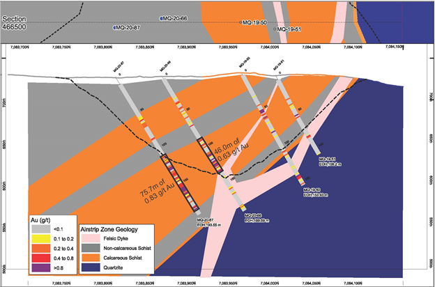 Drill holes MQ-20-85 to MQ-20-89 were located in West Airstrip to follow-up on the promising results of MQ-20-66 and MQ-20-67; where noteworthy grade-width gold mineralization was encountered in Phase 1 2020 drilling (news release September 21, 2020). Consistent with the geological model, the target calcareous schist unit showed significant quartz-calcite-pyrrhotite alteration, a key indicator for gold mineralization at Airstrip. Importantly, 2020 drill results have extended the strike length of the mineral zone by approximately 300 m to the West and also down dip within the conceptual pit limits used to constrain the 2020 Airstrip mineral resource estimation. Further definition of the western strike extent of the Airstrip Deposit will be a high priority for 2021 exploration efforts as the Deposit remains open to the West where a higher-grade trend is interpreted to exist.