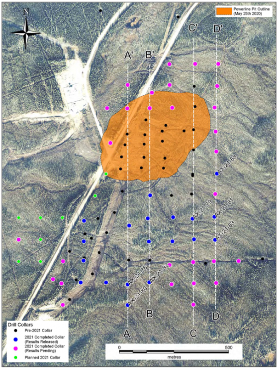 Figure 1 shows the current status of the 2021 drill program at Powerline as well as the proposed Aurex Hill drilling which is slated to begin shortly. The locations of drill holes presented in this news release are shown on Figure 2 and sections with results are shown in Figures 3 through 6. Tables of complete results with collar locations are located on the Company website and will be updated regularly to include new results as they become available.
