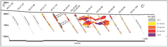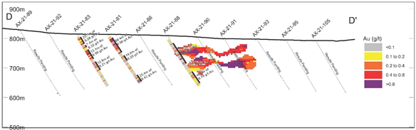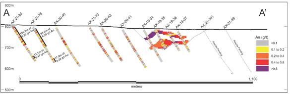 - 0.47 g/t Au over 13.1 metres from 175.3 m in AX-21-80