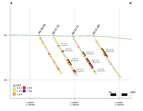 - 0.55 g/t Au over 51.9 metres from surface 115.8 m in AX-21-71