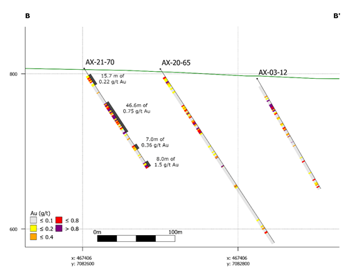 - 0.75 g/t Au over 46.6 metres from 52.5 m in AX-21-70