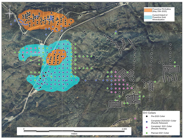 Figure 1: 2021 Drill program at Powerline and Aurex Hill, showing historic, completed and planned diamond drill holes with interpreted area of influence for the Poweline Zone noted.