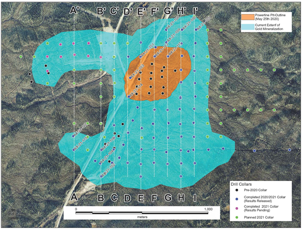 2021 Drilling at Powerline to date consists of ninety-five (95) diamond drill holes totalling 18,738 m. The May 25, 2020 Powerline resource was based on fifteen (15) drill holes totalling 2,269 m. Gold mineralization is interpreted to be associated with swaths of quartz veins dipping shallowly to the north, and within pyrrhotitic horizons with a dip to the south. The combination of the two controls of gold mineralization equate to sub-horizontal mineralization envelopes at the current drill hole spacing.