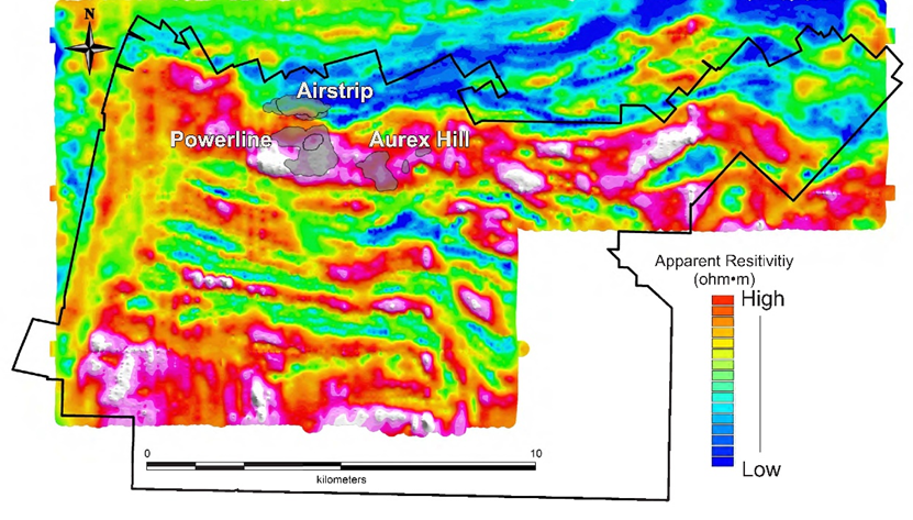 Gold mineralization at Powerline and Aurex Hill is interpreted to be hosted in a sub-horizontal quartz vein system that dips approximately 15 degrees to the NNW. This vein system is hosted in a siliceous package of rocks that can be traced for approximately 16 km within the AurMac property boundaries (Figure 1). Another focus of 2022 work is to refine the structural controls on the vein hosted gold within this package of resistive rocks and use this to improve drill targets.