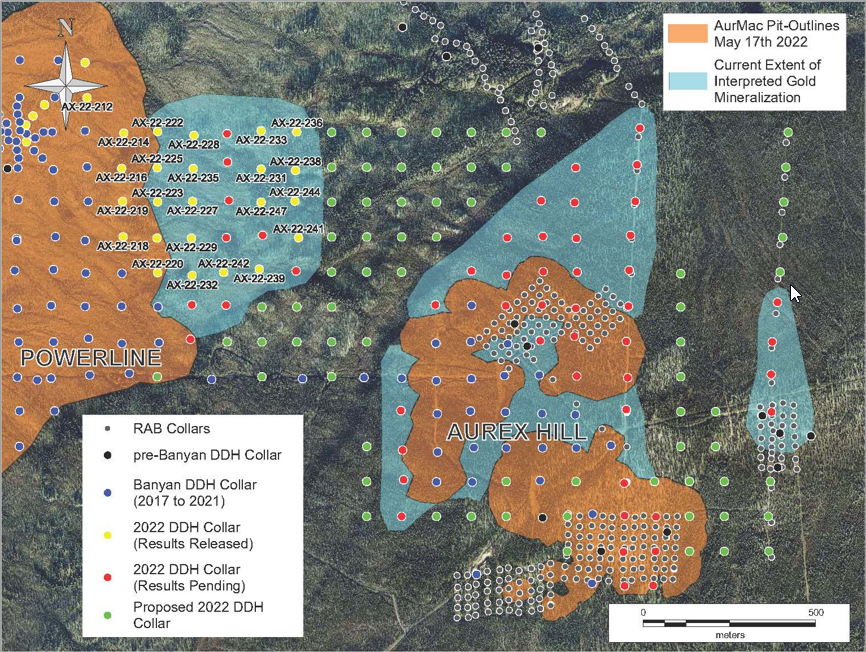 “The ongoing 2022 drill program continues to expand the gold mineralized footprint of the Powerline and Aurex Hill Deposits on the AurMac Property,” Tara Christie, President & CEO of Banyan stated. “With over 38,000 m of drilling now complete in 2022, consistent and widespread gold mineralization from surface continues to demonstrate there is considerable expansion potential of the Resources on the AurMac Property”