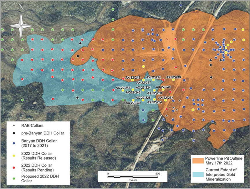 Results from these thirty-six (36) 2022 drill holes are consistent with previous exploration drill results at the Powerline Deposit (see Table 1, Figures 1 and 2) and the areal extent of interpreted gold mineralization from near/on-surface continues to be confirmed with each batch of assay results received.
