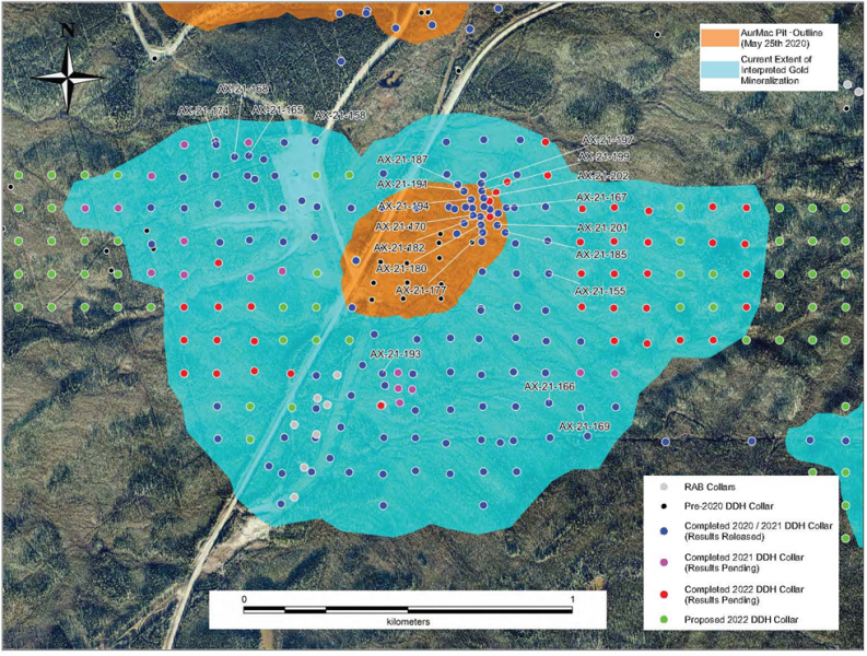 - 69.4 m of 0.63 g/t Au from 125.9 m in DDH AX-21-170