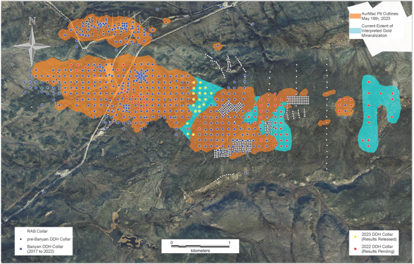 Figure 1: AurMac Drill Hole Locations, showing the location of historic and Banyan completed diamond drill holes used in MRE (grey, black and blue dots) and collar locations of 2023 drilling (red and yellow dots).
