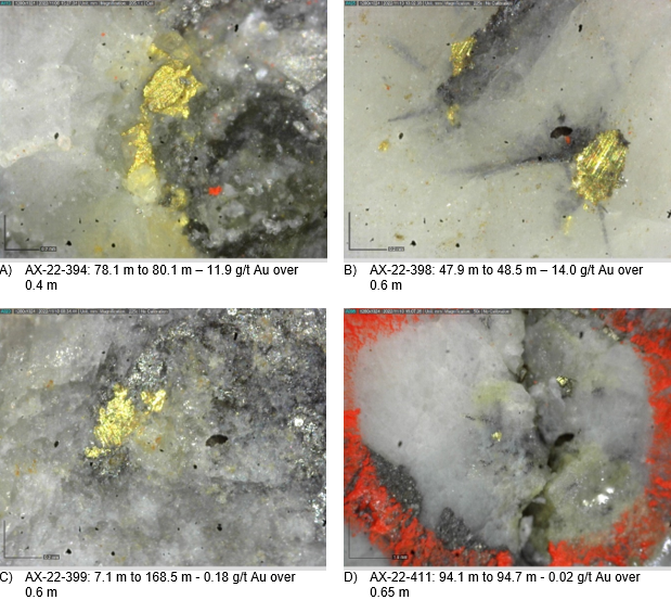 Thirteen (13) drill hole core splits reported in this news release (AX-22-368, -380, -383, -386, -388, -391, -395, -401, -405, -408 to -411) were analysed by MSALABS of Langley, BC, utilizing the aqua regia digestion ICP-MS 39-element IMS-116 analytical package with FAS-121 50-gram Fire Assay with AAS finish for gold on all samples. The remainder of the forty-four (44) drill hole core splits reported in this news release were analysed by Bureau Veritas Minerals of Vancouver, BC, utilizing the aqua regia digestion ICP-MS 36-element AQ200 analytical package with FA450 50-gram Fire Assay with AAS finish for gold on all samples.