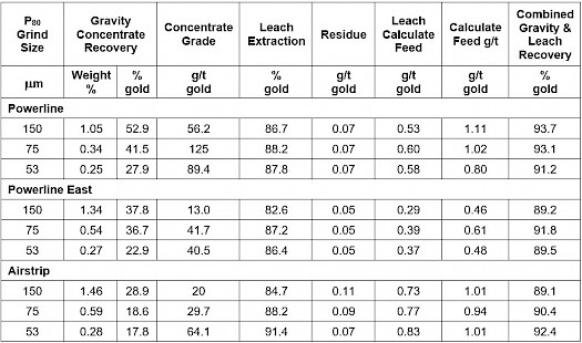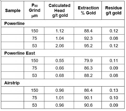 - Gold recovery of 93%, 92% and 90% from Powerline, Powerline East and Airstrip, respectively, utilizing conventional gravity separation and whole ore leaching (CIL/CIP) at a grind size of 75 microns (“mm”).