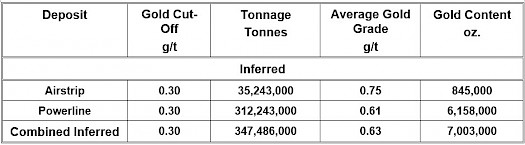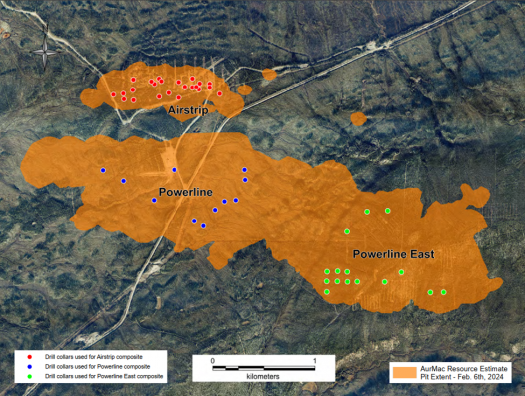 The inferred MRE for the AurMac Project was prepared on February 6, 2024, and consisted of 7,003,000 ounces of gold (see Table 4) hosted within near surface, road accessible pit constrained Mineral Resources contained in two near/on-surface deposits: the Airstrip and Powerline Deposits.