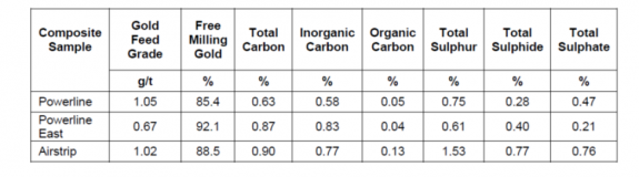 Head samples were assayed for gold, carbon speciation, sulphur speciation, metals, and gold deportment. The total sulphur in the samples ranged from 0.61% to 1.53%, and total carbon ranged from 0.63% to 0.90% predominantly as inorganic carbon (>85%) (Table 1). The gold feed grade for the master composite material for Powerline, Powerline East and Airstrip were found to be 1.05, 0.67 and 1.02 g/t. A gold deportment study was completed on the three composites indicating free milling gold of 85.4%, 92.1% and 88.5% for Powerline, Powerline East and Airstrip, respectively.