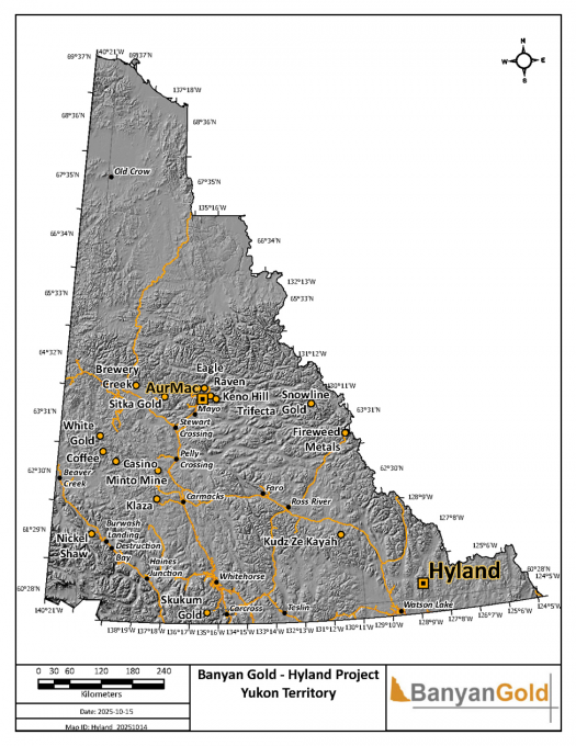 VANCOUVER, BC, October 27, 2025 - Banyan Gold Corp. (the "Company" or "Banyan") (TSX-V: BYN) (OTCQB: BYAGF) is pleased to announce an updated Mineral Resource Estimate (the “MRE” or the “Mineral Resource”) prepared in accordance with National Instrument 43-101, Standards for Disclosure for Mineral Projects (“NI 43-101”) for the Hyland Project (“Hyland” or the “Project”), Yukon, Canada, an additional property to Banyan’s flagship Aurmac Property as defined below in “about Banyan”. The updated MRE incorporates all drilling completed through 2018 and reflects the most current information available, as no further drilling has been completed since then.