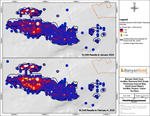 Figure 1: AurMac Diamond Drill Grade Thickness Intervals Map. The calculation utilized for the presentation is Au Grade (g/t) x Interval (m). The grade thickness map was calculated using ESRI kernel density method. Where a drillhole has multiple intervals, the highest interval is used in the calculation. Map A: presents all analytical results to January 2024. Map B: presents an update of all analytical results through this February 4, 2025 news release.