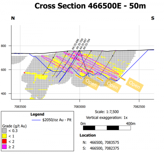 • AX-25-700 – 3.07 g/t Au over 3.6m within 0.69 g/t Au over 29.3m, and 1.90 g/t Au over 17.3m; including 33.00 g/t Au over 0.8m