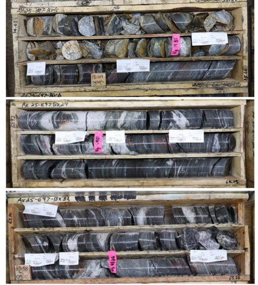Figure 3: Zones of sheeted-veins in drillhole AX-25-697 in central Powerline.