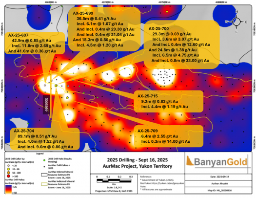VANCOUVER, BC, October 21, 2025 - Banyan Gold Corp. (the "Company" or "Banyan") (TSX-V: BYN) (OTCQB: BYAGF) is pleased to announce it has intersected high-grade gold at surface in the core of the Powerline Deposit (“Powerline”) at its AurMac Project (“AurMac”) in the prolific Tombstone Belt, Yukon, Canada.