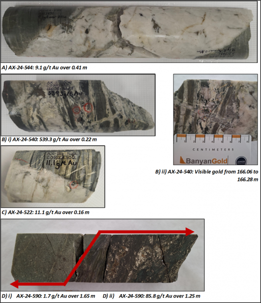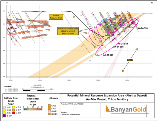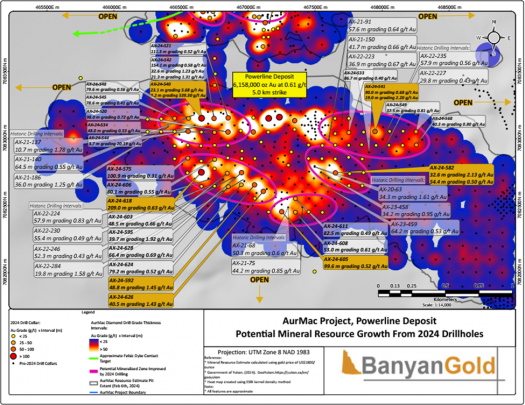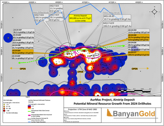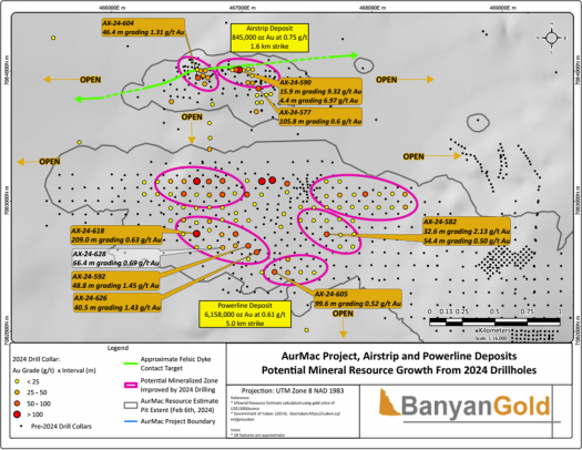 VANCOUVER, BC, March 3, 2025 - Banyan Gold Corp. (the "Company" or "Banyan") (TSX-V: BYN) (OTCQB: BYAGF) is pleased to announce a comprehensive summary of the 2024 AurMac definition drill program results. The 21,000 metre diamond drill program included 118 diamond drillholes collared within the Airstrip and Powerline Deposits which are located on the Company’s AurMac Project, within Yukon’s prolific Tombstone Gold Belt. 2024 drilling was highly successful with visible gold observed in multiple drillholes and multiple intersections of high-grade gold mineralization near surface and at depth in both the Airstrip and Powerline Deposits. The 2024 drill program has increased confidence in the Mineral Resources at AurMac and has demonstrated the potential to grow both the size and gold grade at the AurMac Project. An updated Mineral Resource estimate (“MRE”) expected in Q2 of 2025.