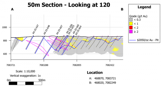 Figure 2: 50m Cross Section in northeast Powerline. Intersection in AX-25-667 extends mineralization up dip and shows potential for waste block conversion within the conceptual pit outline (magenta outlines)