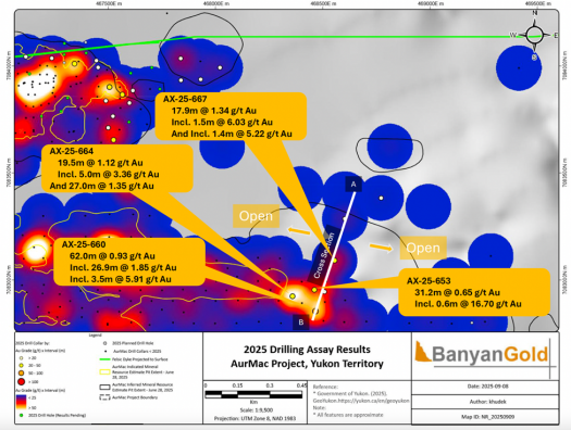 VANCOUVER, BC, September 15, 2025 - Banyan Gold Corp. (the "Company" or "Banyan") (TSX-V: BYN) (OTCQB: BYAGF) is pleased to announce it has intersected multiple instances of visible gold in sheeted veins at the Powerline deposit (“Powerline”) at its AurMac Project (“AurMac”) in the prolific Tombstone Belt, Yukon, Canada. High-grade Gold (“Au”) in drillholes AX-25-660, 664, and 667 highlight the potential for further high-grade gold intervals in Powerline and confirm new 3D modelling mineralized domains. These holes also highlight the potential infill drilling to convert waste blocks to ore blocks with improved continuity of high-grade mineralized domains extending beyond the current Mineral Resource Estimate (“MRE”) (see Table 3 below) conceptual pit boundary (Figure 1; Tables 1 and 2). To date, over 29,000m (127 holes) have been drilled by the Company this year on the AurMac Project, with drilling currently ongoing.
