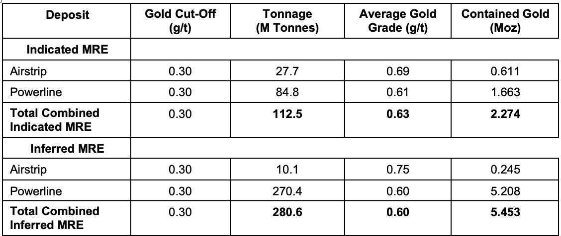 - Mineral Resources are reported at a cut-off grade of 0.30 g/t gold for all deposits, using a US$/CAN$ exchange rate of 0.73 and constrained within an open pit shell optimized with the Lerchs-Grossman algorithm to constrain the Mineral Resources with the following estimated parameters: gold price of US$2,050/ounce, US$2.50/t mining cost, US$10.00/t processing cost, US$2.00/t G+A, 90% gold recoveries, and 45° pit slopes.[1]