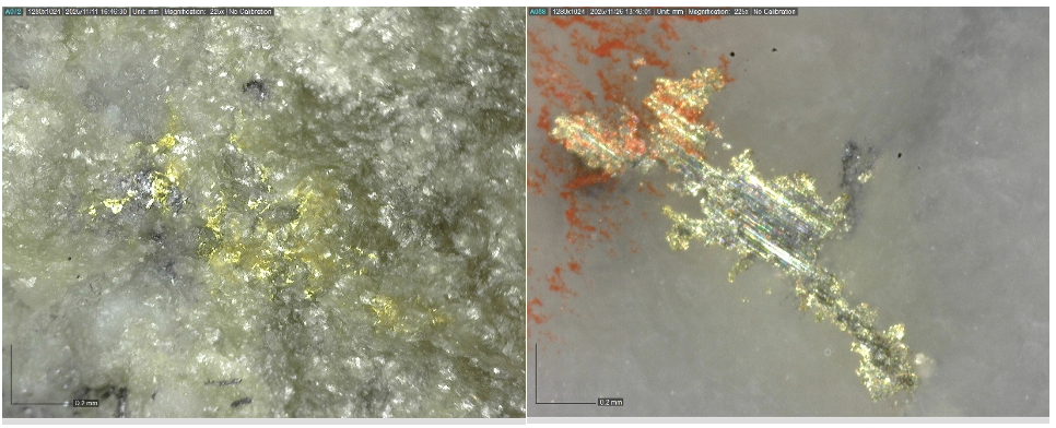 Figure 2: Visible gold intersections in drillholes from Central Powerline. Top left - AX-25-801 – 81.4m. Top Right – AX-25-819 – 118.3m. While visible gold at Powerline is typically (but not always) indicative of high-grade intervals, the potential for heterogeneous gold distribution in a recovered drill core and analyte material processed by the laboratory means not all instances of visible gold will be reflected in high-grade assay results.