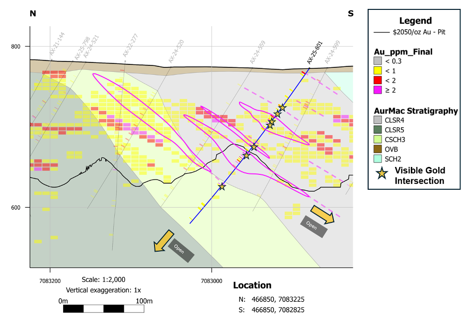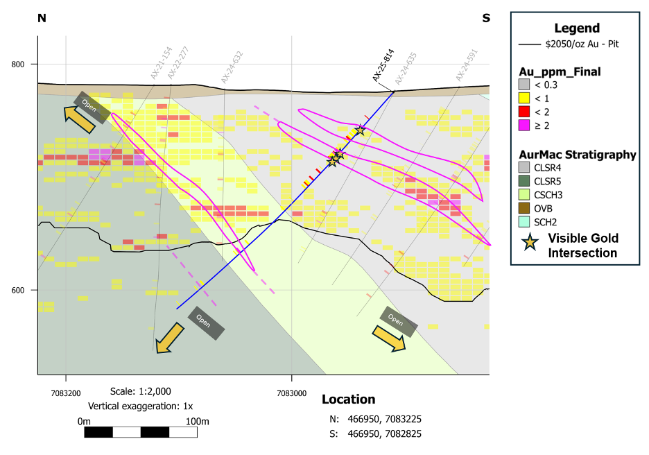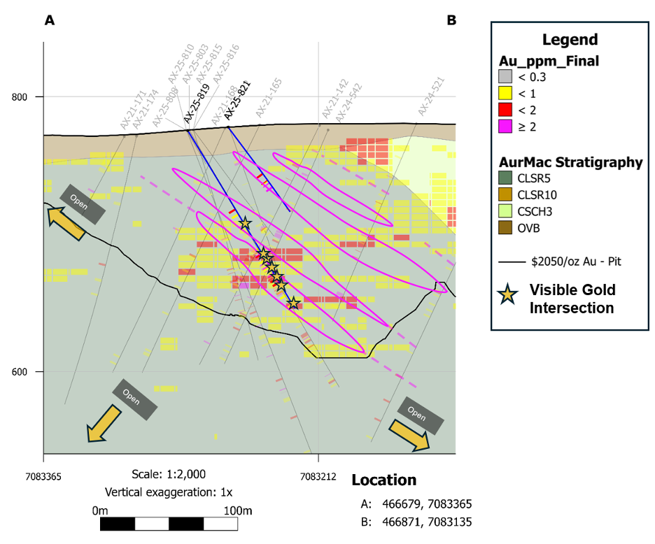 Figure 3: Cross-section A-B in Central Powerline (See Figure 1). High-grade mineralization in AX-25-819 and -821 has the potential to extend mineralized domains below the conceptual pit boundary from the 2025 Mineral Resource Estimate (“MRE”). Magenta outlines show preliminary potential mineralized zones. Once refined, these domains will aid in better constraining estimations of the distribution of gold in the MRE.
