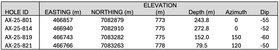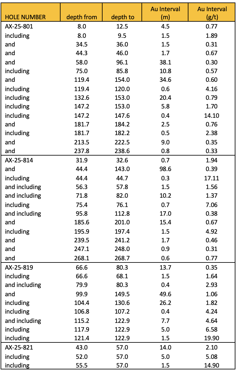 - AX-25-819 – 1.82 g/t Au over 26.2m and 4.64 g/t Au over 7.7m, within 1.06 g/t Au over 49.6m; includes high-grade interval of 19.90 g/t Au over 1.5m;