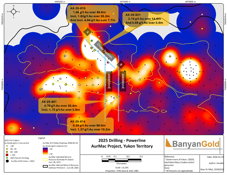 VANCOUVER, BC, February 26, 2026 - Banyan Gold Corp. (the "Company" or "Banyan") (TSX-V: BYN) (OTCQB: BYAGF) is pleased to announce high-grade gold (“Au”) mineralization and associated visible gold (“VG”) in central Powerline Deposit (“Powerline”) at its AurMac Project (“AurMac”), Yukon, Canada.