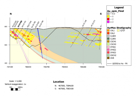 Figure 4: Cross-section 467000mE in Airstrip. Mineralization in AX-25-799 and -807 (Figures 5-7) have potential to extend high-grade mineralization, convert waste blocks and extend the conceptual pit wall.