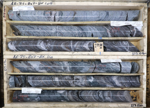 - AX-25-807 – 1.93 g/t Au over 10.4m and 1.00 g/t Au over 36.1m within 0.64 g/t Au over 145.5m