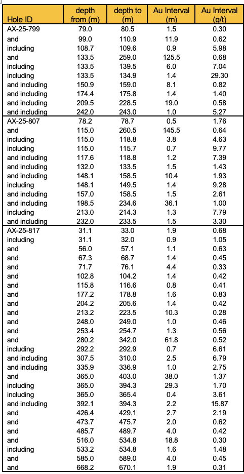 - AX-25-799 – 7.04 g/t Au over 6.0m within 0.68 g/t Au over 125.5m; including high-grade intervals of 29.30 g/t Au over 1.4m