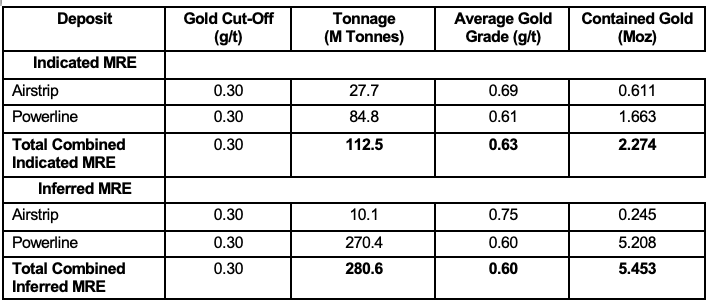 4. Mineral Resources are reported at a cut-off grade of 0.30 g/t gold for all deposits, using a US$/CAN$ exchange rate of 0.73 and constrained within an open pit shell optimized with the Lerchs-Grossman algorithm to constrain the Mineral Resources with the following estimated parameters: gold price of US$2,050/ounce, US$2.50/t mining cost, US$10.00/t processing cost, US$2.00/t G+A, 90% gold recoveries, and 45° pit slopes.