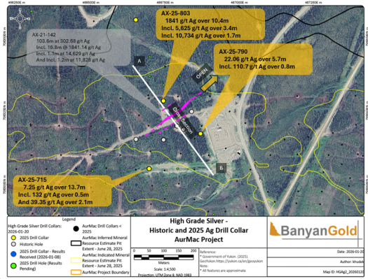 VANCOUVER, BC, January 22, 2026 - Banyan Gold Corp. (the "Company" or "Banyan") (TSX-V: BYN) (OTCQB: BYAGF) is pleased to announce it has intersected a very high-grade silver (“Ag”) interval near previous high-grade intersections in the Ag-1 vein at the Powerline Deposit (“Powerline”) at its AurMac Project (“AurMac”), Yukon, Canada.