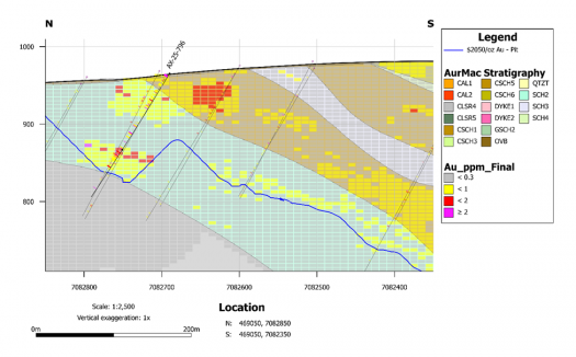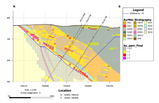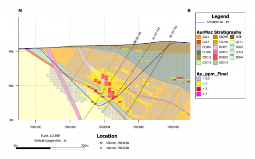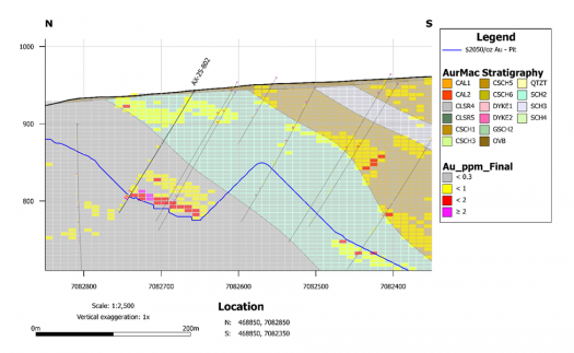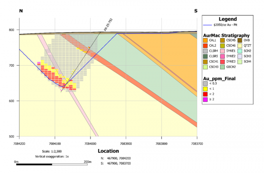 Figure 3: Cross-section 469050E in Aurex Hill Zone has potential to extend high-grade mineralization in satellite pits in east Powerline.