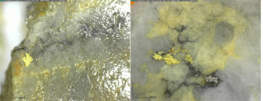 Figure 6: Visible gold grains from drillholes AX-25-796. Multiple instances of visible gold intergrown with Bi-Sulphosalts were intersected at 42.3m (left) and 115.1m (right). These examples of coarse-grained gold mineralization in sheeted quartz veins are typical of Powerline-style mineralization, indicating near-surface high-grade mineralized domains have potential to be expanded in the Aurex Hill area east of Powerline.