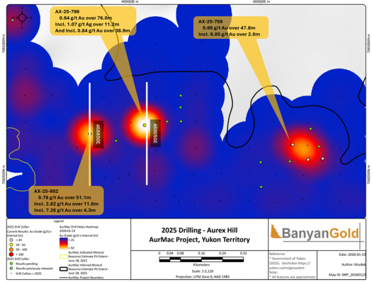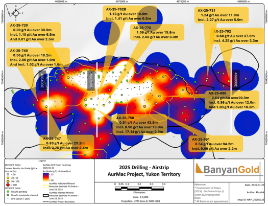 VANCOUVER, BC, Jan 27, 2026 - Banyan Gold Corp. (the "Company" or "Banyan") (TSX-V: BYN) (OTCQB: BYAGF) is pleased to announce it has intersected high-grade gold (“Au”) mineralization in the Airstrip Deposit (“Airstrip”) and Aurex Hill Zone (“Aurex Hill”) at its AurMac Project (“AurMac”), Yukon, Canada.