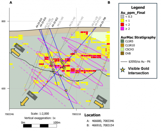 Figure 3: Cross-section A-B in Central Powerline (See Figure 1). High-grade mineralization in AX-25-798, -810 and -822 has the potential to extend mineralized domains just below the conceptual pit boundary from the 2025 MRE. Magenta outlines show preliminary potential mineralized zones. Once refined, these domains will aid in better constraining estimations of the distribution of gold in the Mineral Resource Estimate.