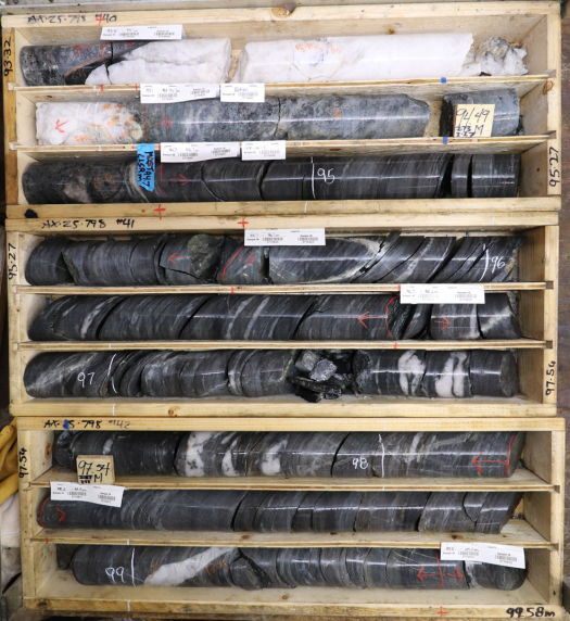 - AX-25-798 – 1.91 g/t Au over 11.4m, 2.00 g/t Au over 25.0m, 4.59 g/t Au over 5.0m, 1.44 g/t Au over 5.0m, and 1.12 g/t Au over 7.5m, all within 0.61 g/t Au over 239.2m; includes high grade intervals of 26.61 g/t Au over 0.6m, 14.00 g/t Au over 1.5m, and 18.10 g/t Au over 1.5m;