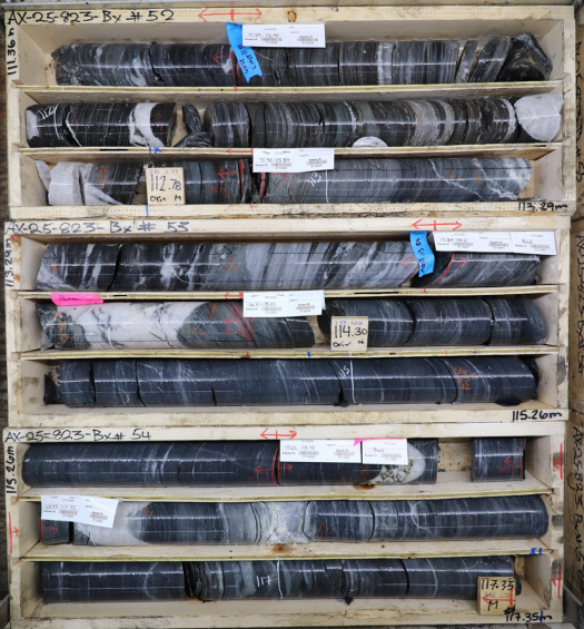 - AX-25-822 – 3.56 g/t Au over 2.3m, within 0.49 g/t Au over 66.6m; includes high-grade interval of 11.65 g/t Au over 0.4m;