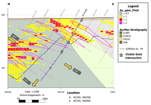 Figure 5: Cross-section 467100mE in Powerline (See Figure 1). Mineralization in AX-25-823 has the potential to extend high-grade mineralization, convert waste blocks and extend the conceptual pit wall. Magenta outlines show preliminary potential mineralized zones. Once refined, these domains will aid in better constraining estimations of the distribution of gold in the Mineral Resource Estimate.