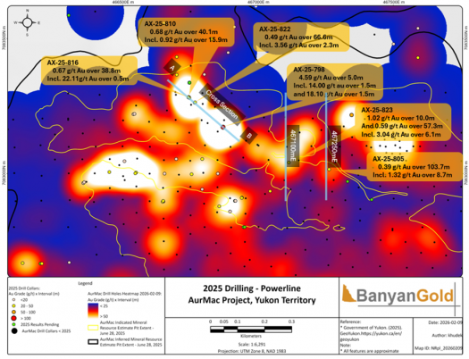 VANCOUVER, BC, Feb 17, 2026 - Banyan Gold Corp. (the "Company" or "Banyan") (TSX-V: BYN) (OTCQB: BYAGF) is pleased to announce it has intersected high-grade gold (“Au”) mineralization and visible gold (“VG”) in numerous intervals in central Powerline Deposit (“Powerline”) at its AurMac Project (“AurMac”), Yukon, Canada.