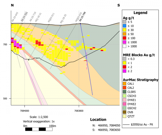 Figure 3: Cross-section A-B in Powerline. Silver intersections within drillholes AX-25-810, -819, and -821 are consistent with late brittle feature for the AG-1 vein intersected in drillhole AX-21-142 and AX-25-803 (see news releases dated October 29, 2025 and January 22, 2026). Two sub-parallel veins have been identified adjacent to the AG-1 vein intersected in holes AX-21-142 and AX-25-803; AG-2 and AG-3 are north and south of AG-1, respectively (magenta veins and dashed traces above). Block model for Au MRE included to highlight cross-cutting nature of silver mineralization.