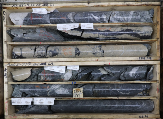 Figure 5: Keno-style mineralization (sphalerite and galena hosted in Fe-carbonate veins) from drillhole AX-25-799 in Airstrip. This intersection represents a new high-grade vein intersection.